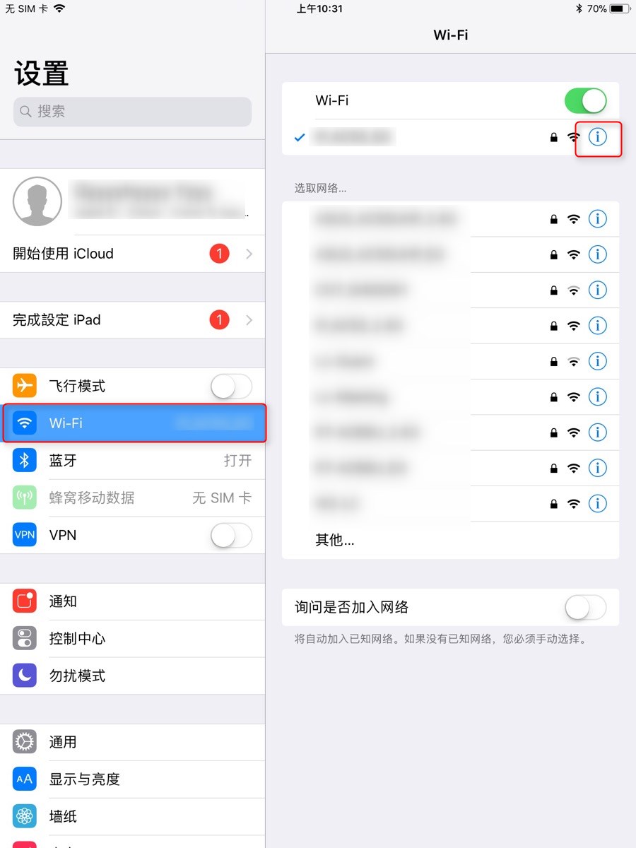 2. 在设置中点击 “ 无线局域网 ” (Wi-Fi) 再点击已连接的 Wi-Fi 名称右边的图标